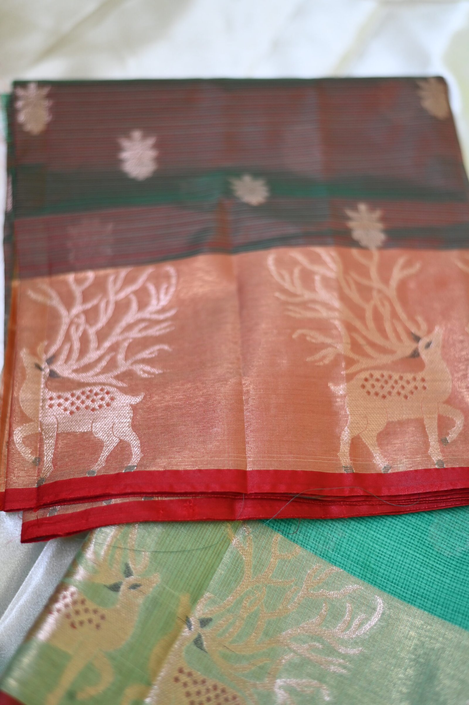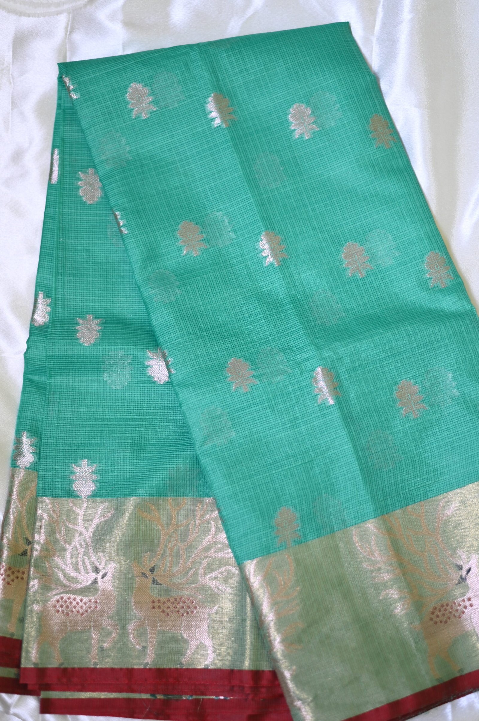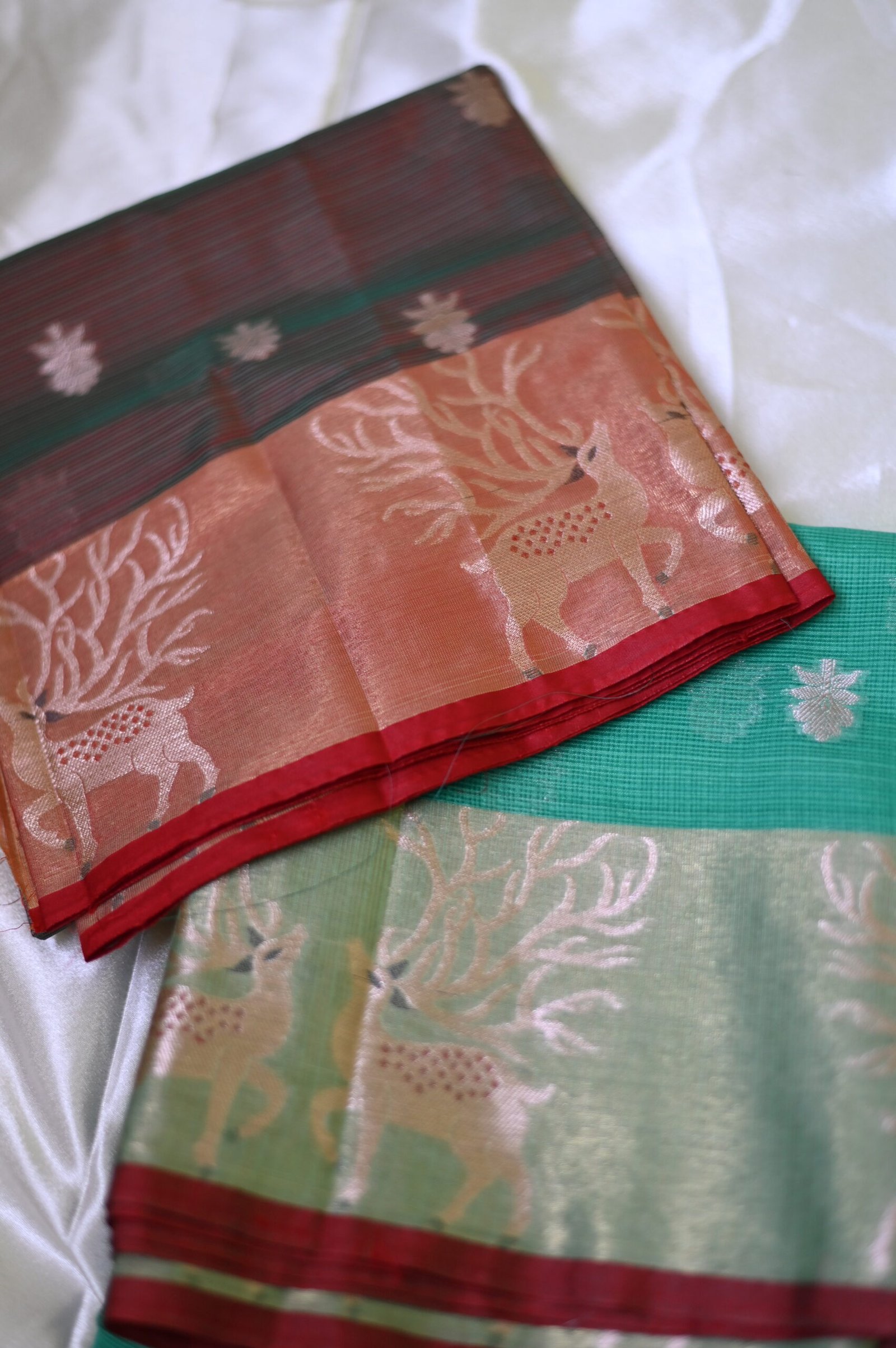 Step into timeless elegance with our benarasi kotasaree, a perfect blend of tradition and grace. This saree features lightweight Kota fabric adorned with intricate Benarasi weaving, making it an ideal choice for weddings, festivals, or special gatherings. The shimmering zari work reflects the artistry of our skilled weavers, giving you a royal yet comfortable drape.