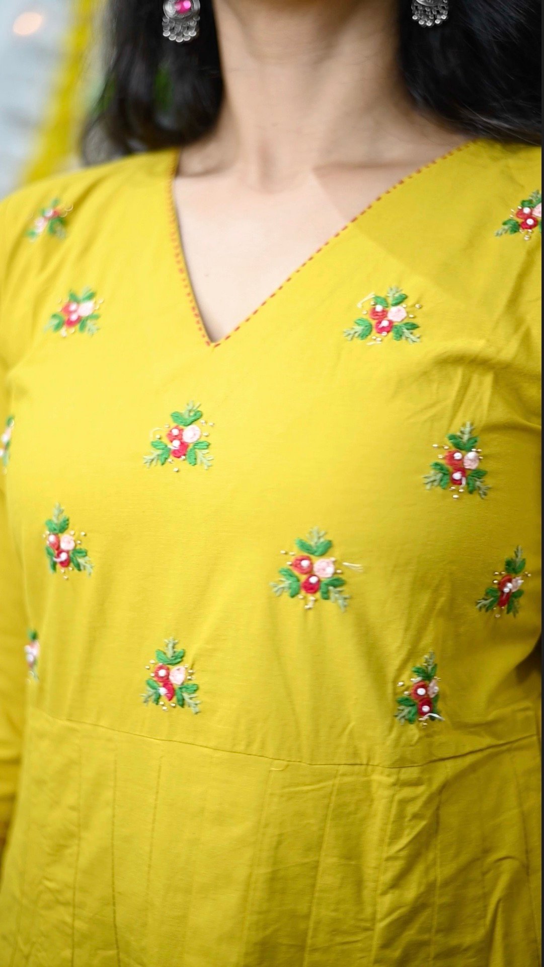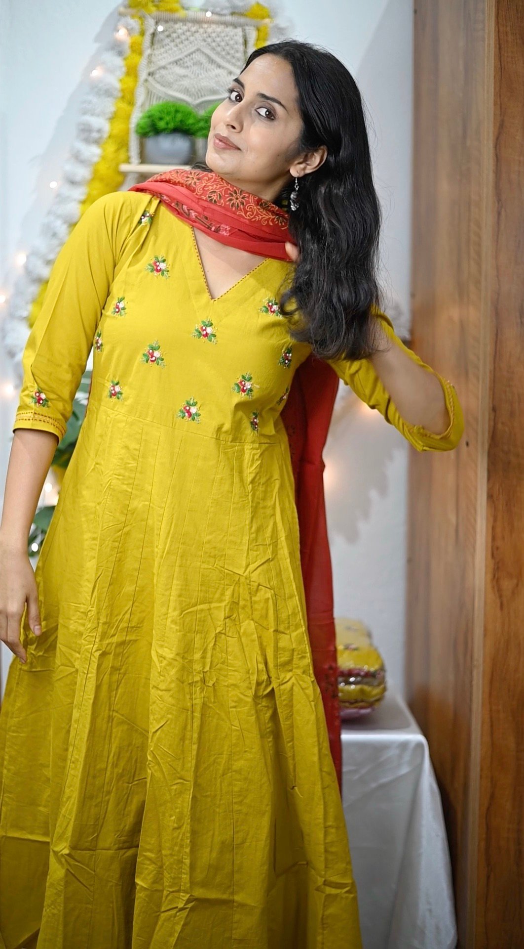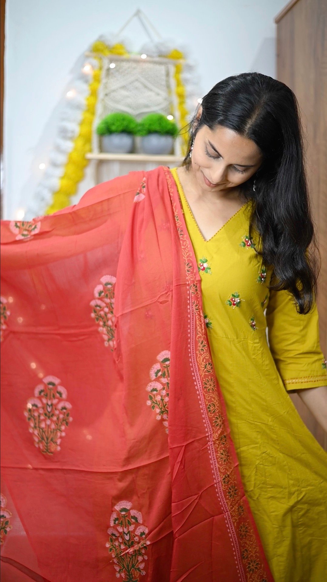 The mustard yellow mulcotton suit set features a beautifully tailored kurta paired with matching bottoms and a coordinated dupatta, creating a complete ethnic look this set is a must-have for women who love effortless grace.